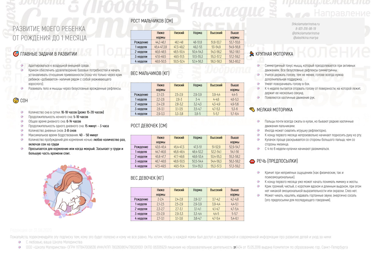 Нормы по возрасту каждый месяц: рост, вес, моторика, сенсорика, мышление, речь, основные задачи развития.